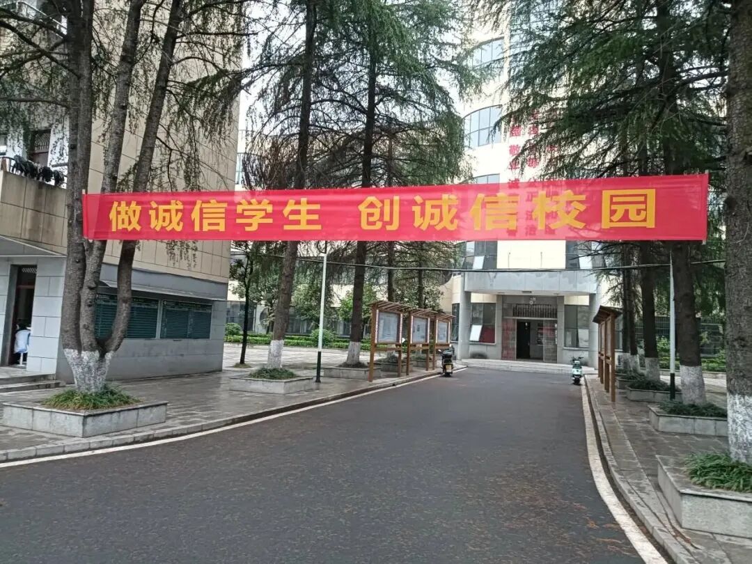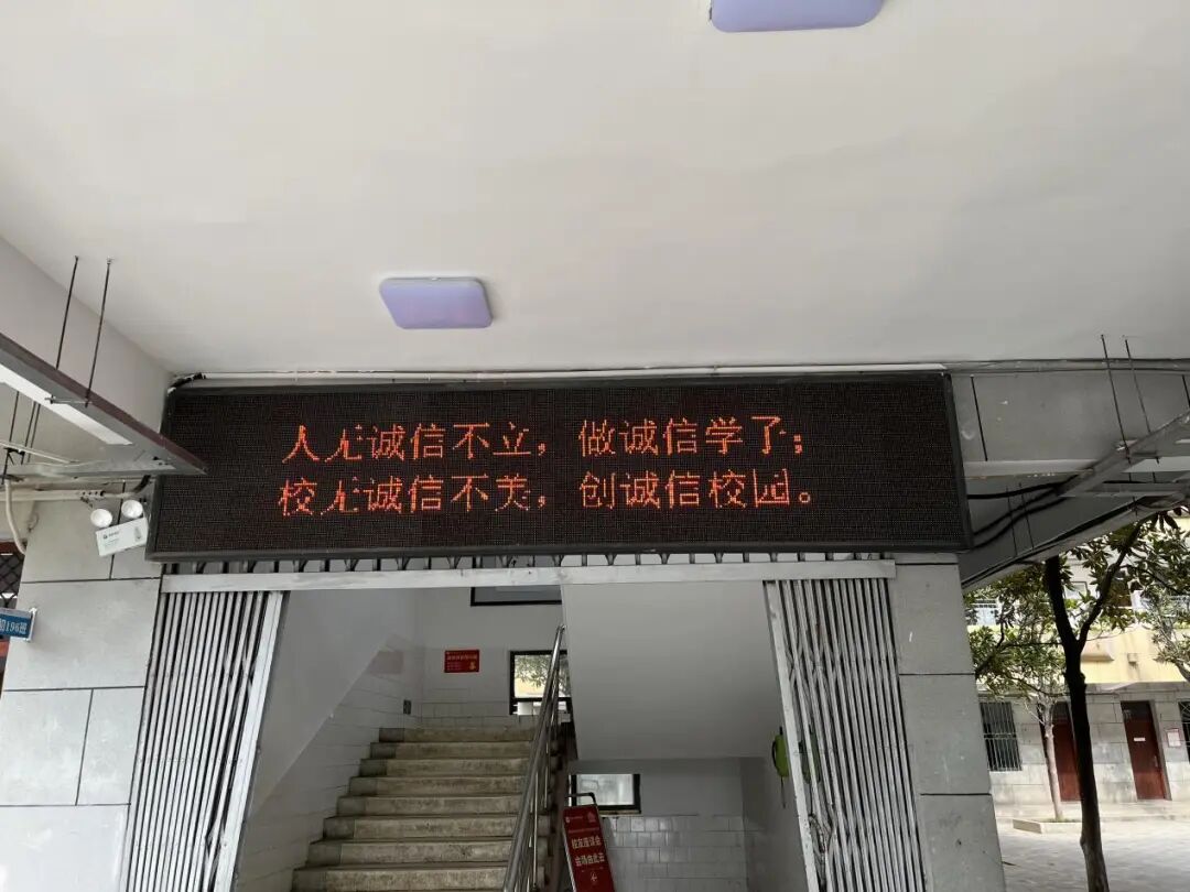 学校运用多种宣传手段,例如在校园主干道上悬挂宣传横幅、在教学楼电子显示屏上展示宣传标语等,号召学生在学习、生活中做一名诚信无欺、信守承诺、言行一致的新时代学生,用自己的实际行动打造“诚实守信”的校园环境。
