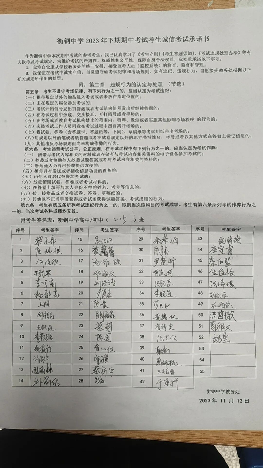通过组织学生签订《衡钢中学2023年下期期中考试考生诚信考试承诺书》,帮助学生树立诚信意识,增强诚信观念,塑造诚信品质。要求学生讲诚信,从小事做起,从我做起,端正考试心态,严格遵守考试纪律。