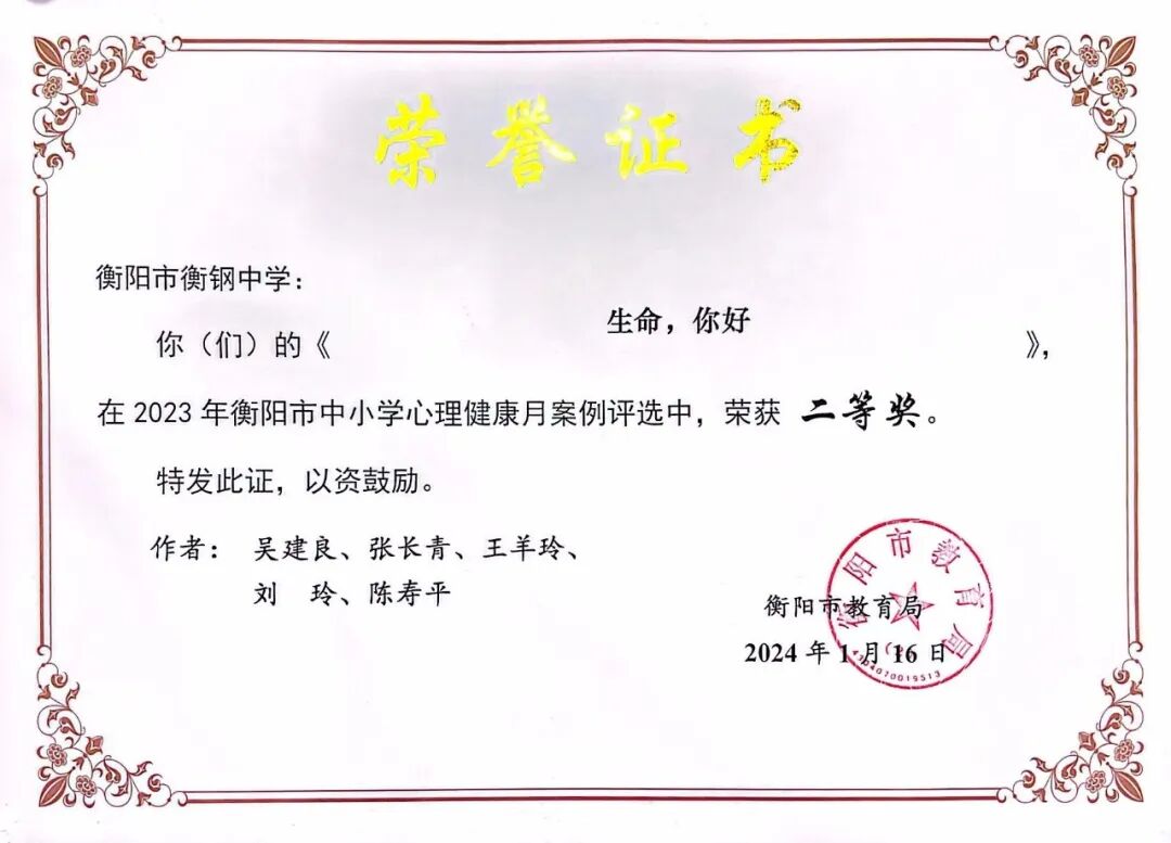 此外,由我校的吴建良、张长青、王羊玲、刘玲、陈寿平五位老师完成的《生命,你好》在2023年衡阳市中小学心理健康月案例评选中,荣获二等奖。